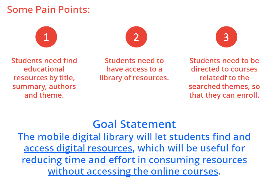 Solution: A mobile digital library that encompasses several online resources to be consumed by students. Students will use the app to find resources and consume them online inside the app.